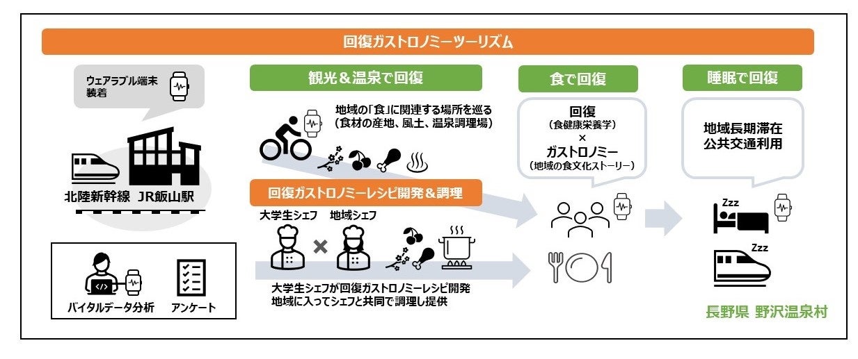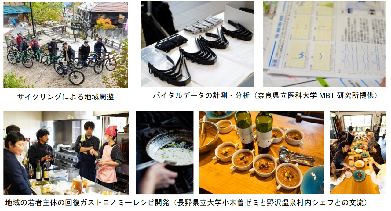 ○東日本旅客鉄道株式会社(本社:東京都渋谷区、代表取締役社長:喜㔟 陽一、以下 JR東日本)、株式会社ジェイアール東日本企画(本社:東京都渋谷区、代表取締役社長:赤石 良治、以下 jeki)、長野県(県知事:阿部 守一)、一般社団法人野沢温泉マウンテンリゾート観光局(代表理事:小田切美幸、以下 野沢温泉DMO)、公立大学法人長野県立大学(理事長:安藤 国威、以下 長野県立大学)、公立大学法人奈良県立医科大学(理事:嶋 緑倫、以下 奈良県立医科大学MBT研究所)は、2024年6月15日、16日において長野県野沢温泉村にて「産官学連携による回復ガストロノミーツーリズム開発及びポテンシャル調査」実証実験(以下、本実証)を行います。 ○本実証は野沢温泉DMOが進める、「野沢温泉ガストロノミーツーリズム※1」の推進支援、県内在住大学生の地域活躍モデルの創出および、移動をキッカケに国内旅行による心身の充足、回復、豊かさ(well-being)を感じられる観光ツアーの産官学連携による開発を目指すもので、JR東日本が設立した「WaaS共創コンソーシアム※2」における地域共創の取り組みの一環です。 ○ガストロノミーツーリズムとは、食を味わう際、それらに関連づく文化や歴史、美観、地理的背景などのストーリーを合わせて楽しむ観光モデルを指します。 ○本実証では、サイクリングでの観光移動を通して地域食材が持つ地域文化や歴史、美観、地理的背景によって生まれたガストロノミーな要素を体験頂くと共に、野沢温泉村内のシェフや、長野県立大学食健康学科小木曽ゼミとの連携により開発した“回復ガストロノミーレシピ”をモニターに味わっていただき、ポテンシャルを調査します。 |