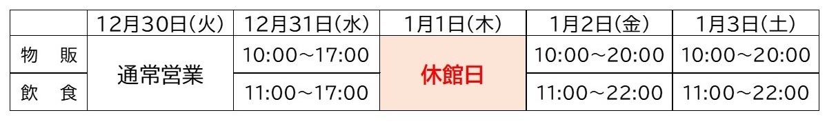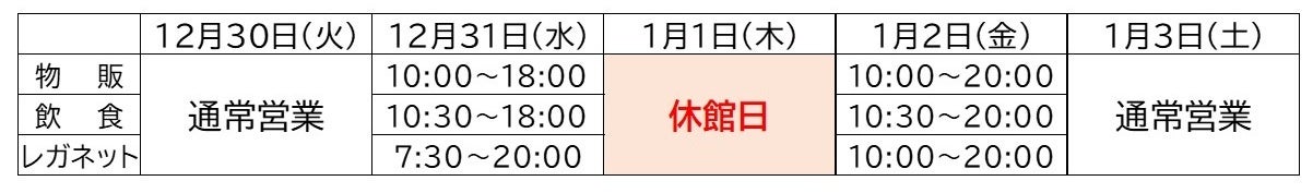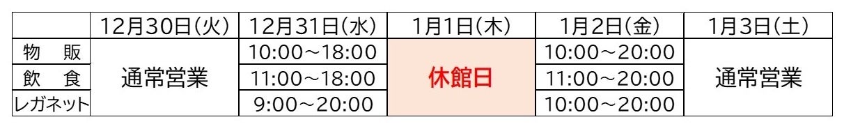 年末年始期間は、各商業施設で一部営業時間を変更し、下記の通り営業いたします。
