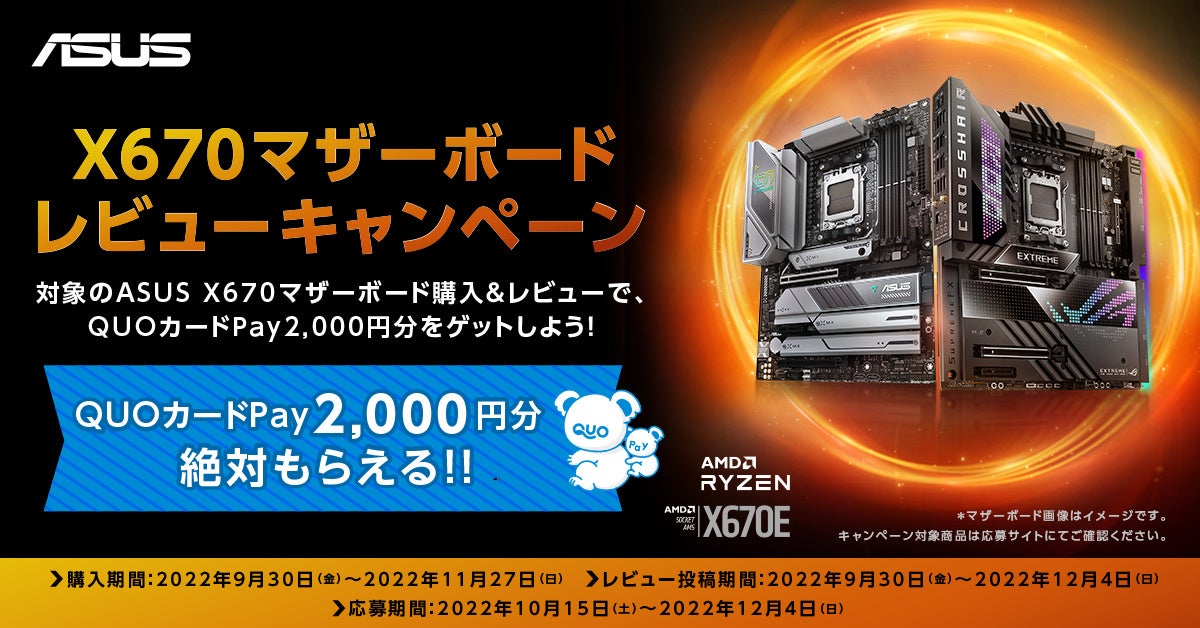 ASUS JAPAN株式会社は、ASUSのAMD X670マザーボード購入者にむけて「ASUS X670マザーボード購入キャンペーン」「ASUS X670マザーボードレビューキャンペーン」の2つのキャンペーンを開催中です。