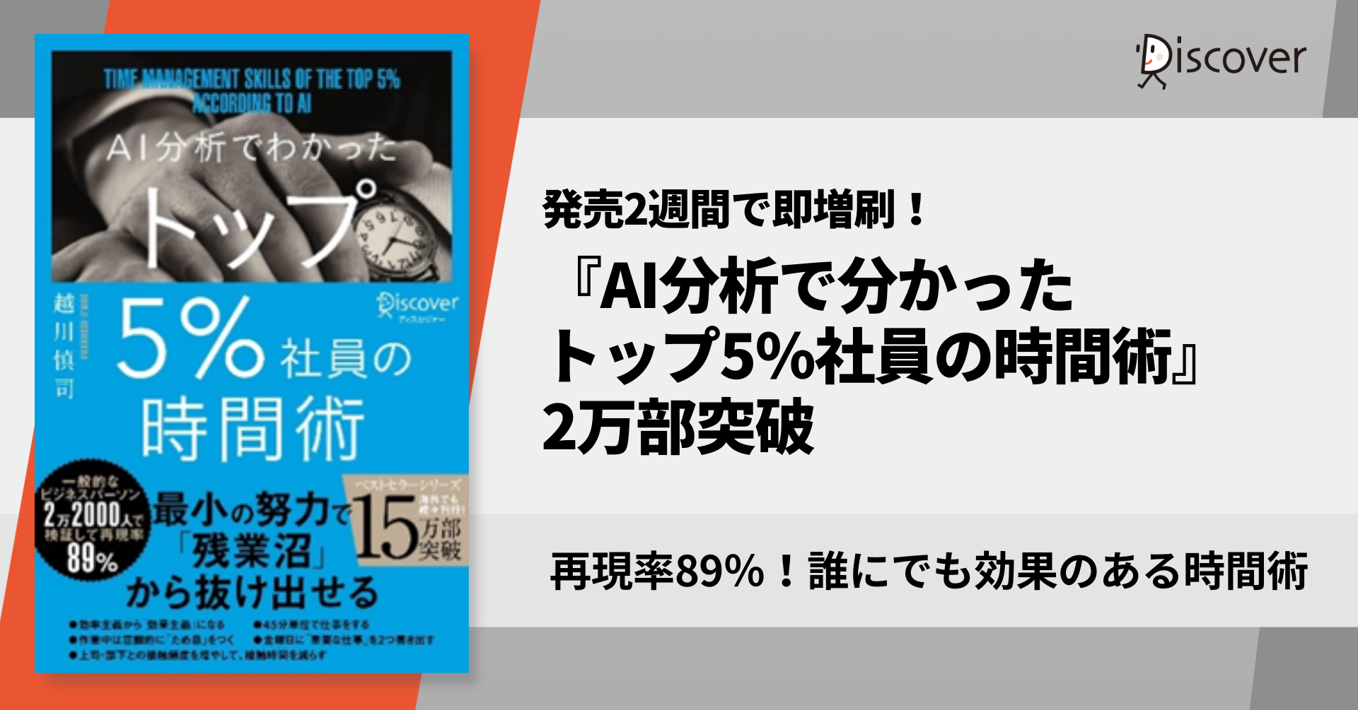株式会社ディスカヴァー・トゥエンティワン(本社:東京都千代田区、取締役社長:谷口奈緒美)は2022年5月27日刊行の『AI分析で分かった トップ5%社員の時間術』(越川慎司・著)を増刷し、2万部を突破しました。