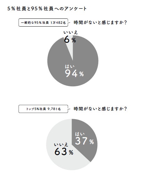 「時間がないと感じますか?」というアンケートをトップ5%社員と95%社員に行ったところ、「時間がないと感じる」と回答した95%社員の94%、トップ5%社員は37%と、大きく意識の差が見られました。