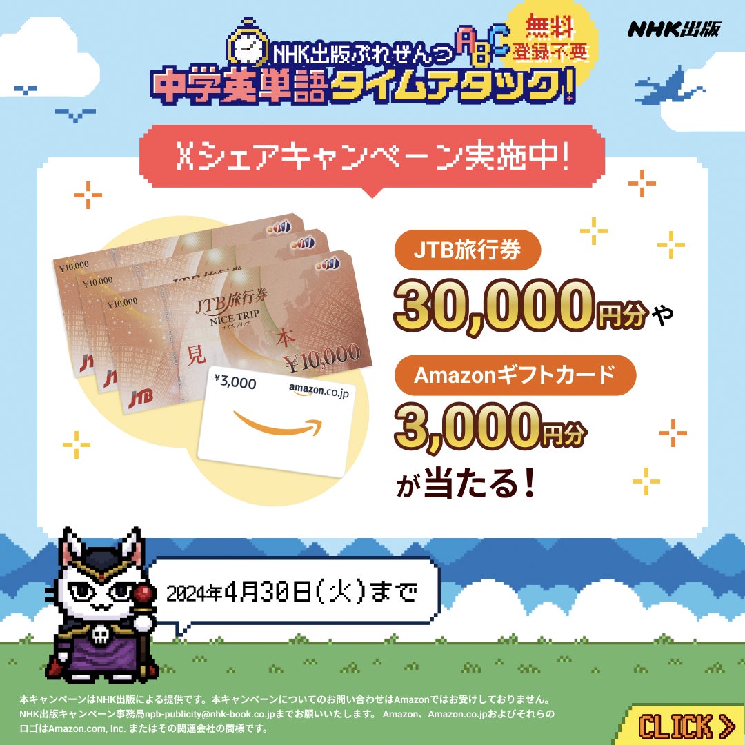 NHK英語テキストの新年度4月号予約開始に合わせ、「中学英単語タイムアタック!」が公開! 約30秒で手軽に英単語の腕試しができます。4月30日まで、豪華景品が当たるXシェアキャンペーンも実施中です。