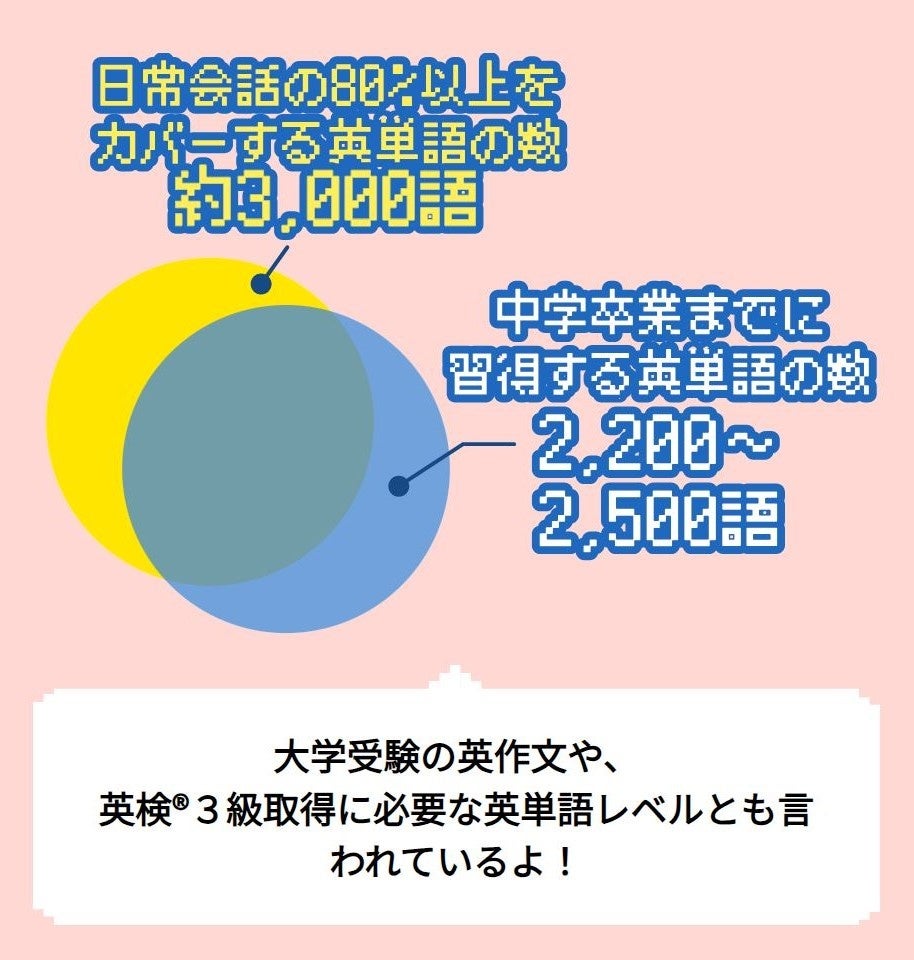日本で中学卒業までに学ぶ英単語は2,200~2,500語ですから、中学レベルの英単語をしっかり押さえておくことが、英語で日常会話レベルの英語を身に付ける鍵ともいえるのです。