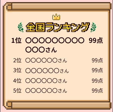 全国ランキングで上位に入ると、自分で登録したニックネームが全国ランキングに掲載されます。