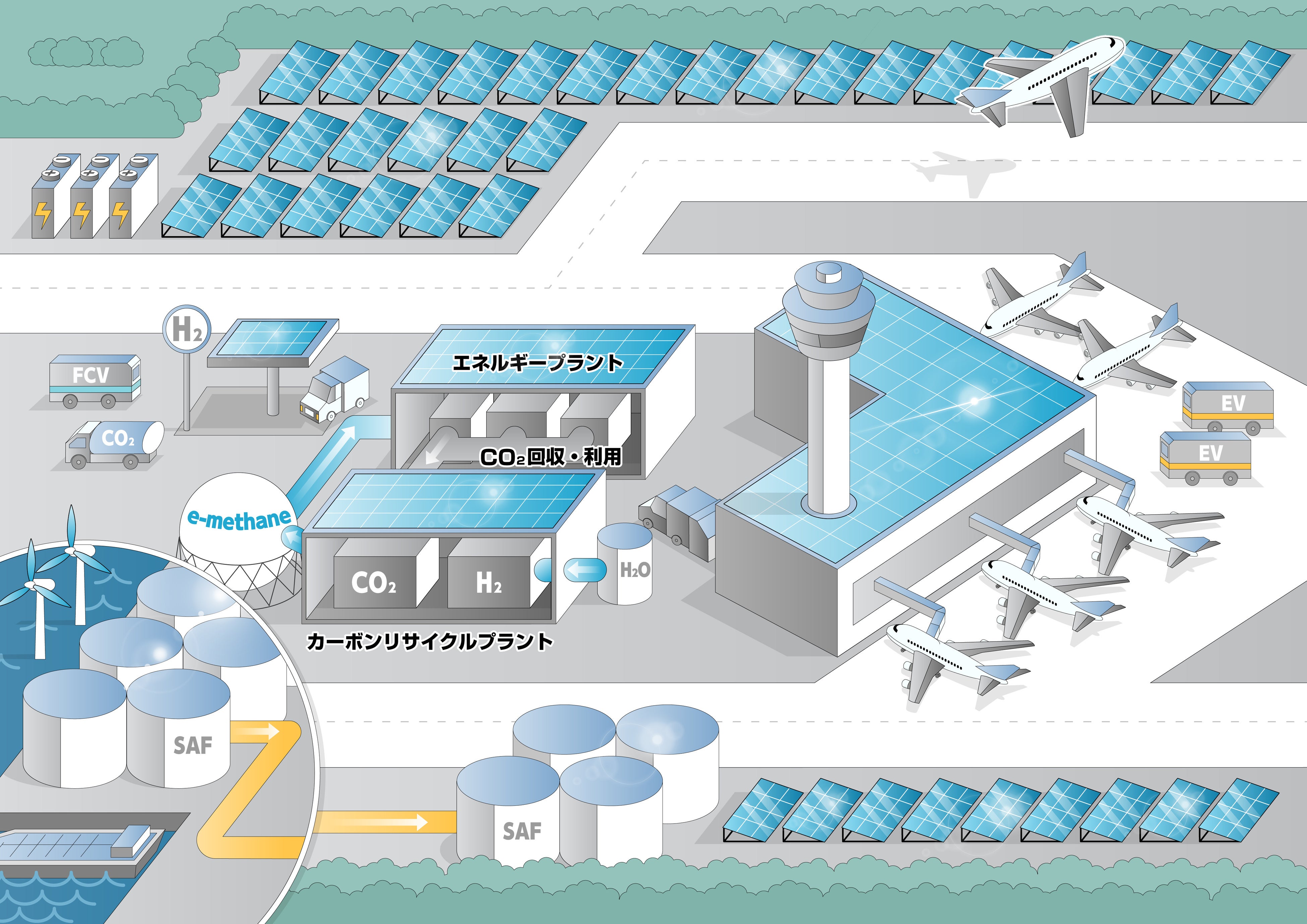 Green Energy Frontierは、NAAが保有している特高受電設備や熱源設備等、エネルギー供給設備を引き継ぎ、東京ガスグループがこれまで培ってきた大規模エネルギープラントの建設・運営ノウハウや大規模太陽光発電、e-methane(*4)等の脱炭素に関する技術を活用することで、エネルギー供給事業と空港の脱炭素化事業に取り組みます。