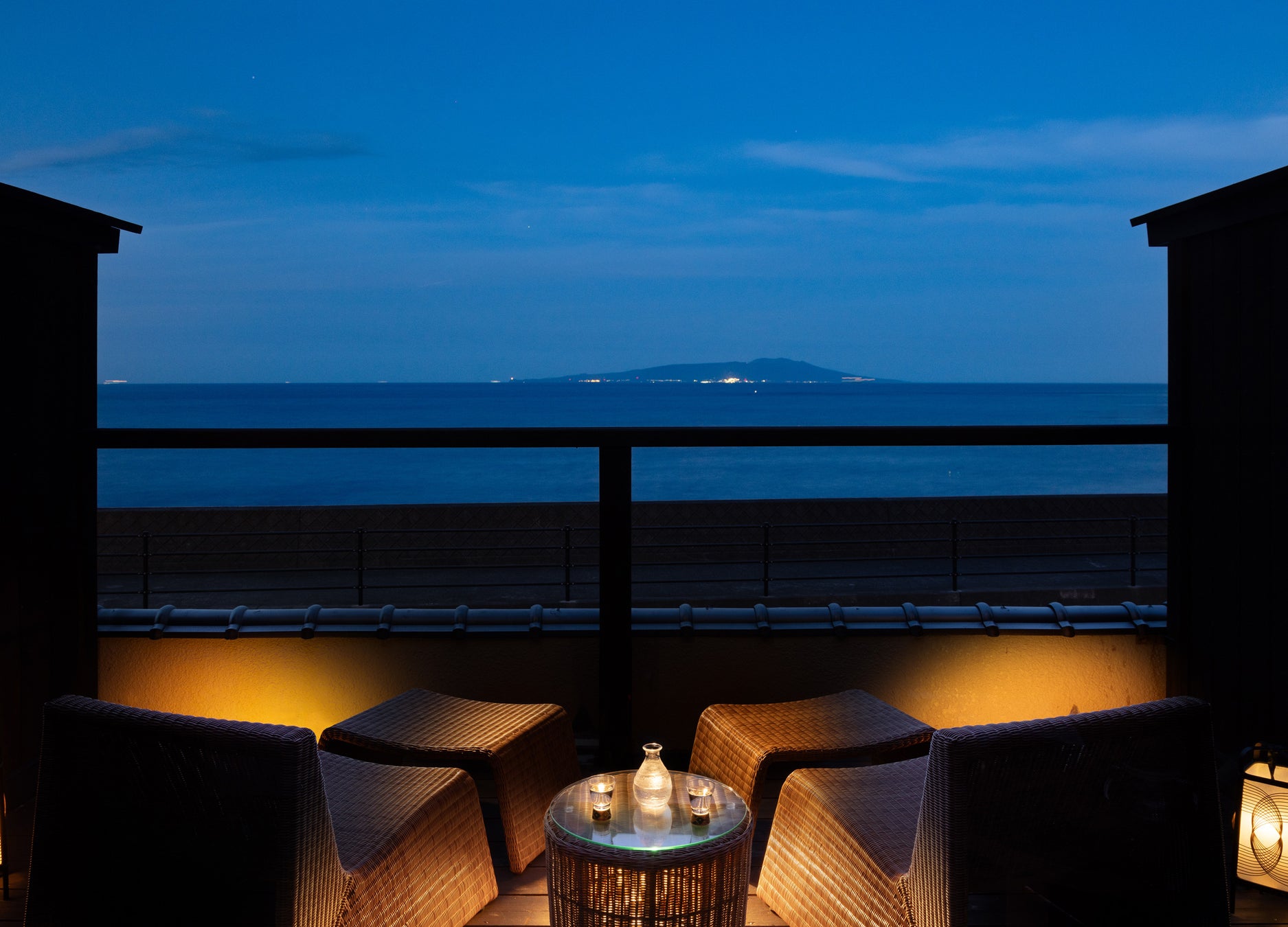 客室には相模湾や伊豆大島を望む、プライベートなウッドデッキにはチェアがあり、煌めく海と昇る朝日、満月には月光が海面に映る「ムーンロード」の絶景を独占します。