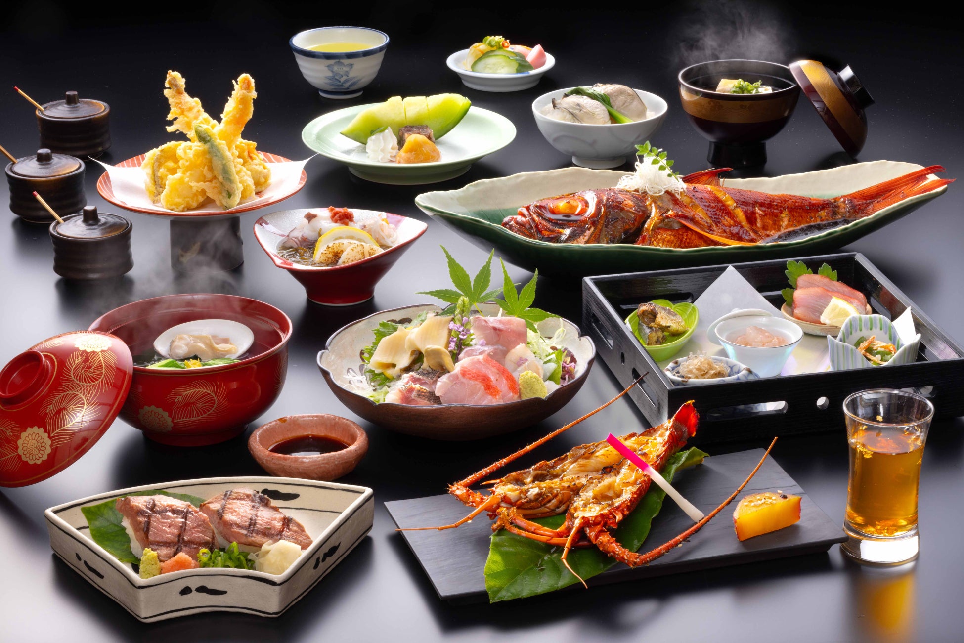 漁獲量日本一の金目鯛、伊勢海老、鮑などの海幸は、お造りや焼物、季節の旬を味わう和会席でお召し上がりください。