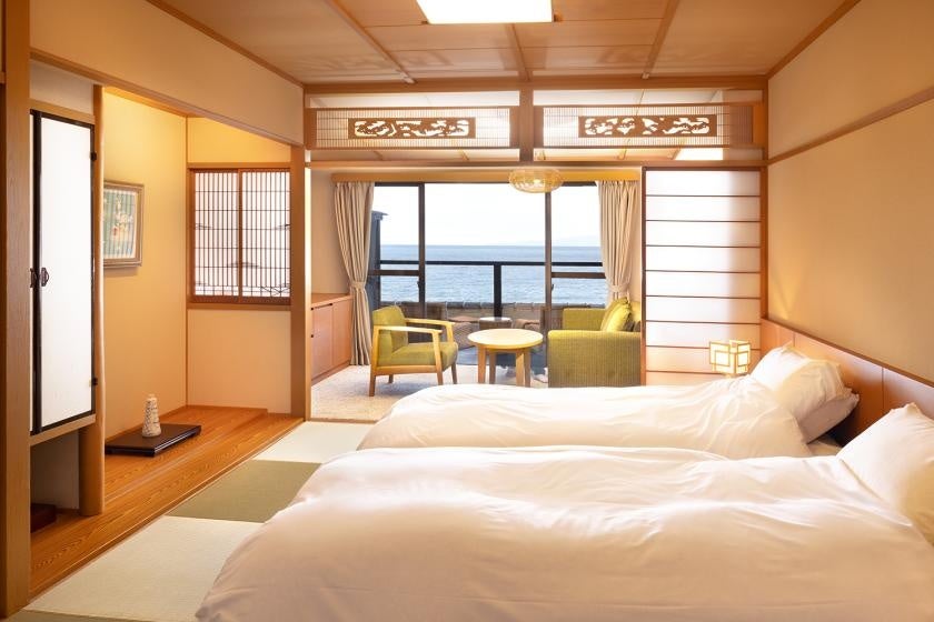 New!3室限定【テラス付き和洋室】海一望のウッドデッキ & エアウィーヴベッド~心地良い東伊豆のごちそう温泉旅へ。