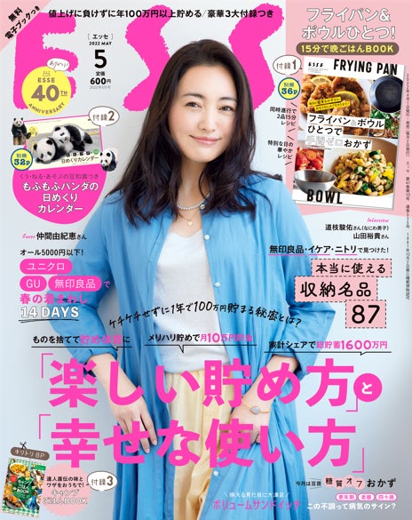 仲間由紀恵さんの表紙が⽬印のESSE5⽉号には、ほかにもプロ・マニア・ESSE読者300名が選んだ「本当に使える収納名品87」や、おかずクラブ・オカリナさん登場のオール5000円以下アイテムで「春の着回し14DAYS」、道枝駿佑さん(なにわ男子)のスペシャルインタビューなど、楽しく暮らしに役⽴つ情報が満載です。