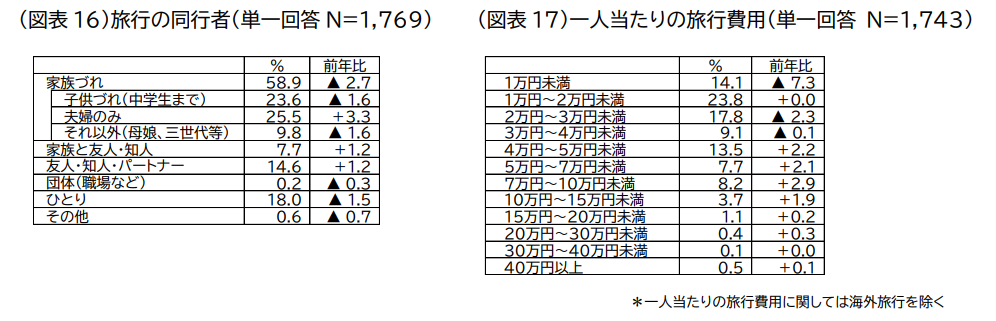 一人当たりの旅行費用:「1万円~2万円未満」が23.8%で最も多く、前年と増減はありませんでした。続く「2万円~3万円未満(17.8%)」は前年より2.3ポイント減少、「1万円未満(14.1%)」は7.3ポイント減少し、3万円未満の合計は55.7%と前年に比べ9.6ポイント減少しています。一方、4万円以上はすべての項目で増加しています(図表17)。
