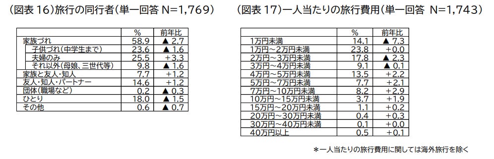 同行者:「夫婦のみ」が25.5%で最も多く、前年より3.3ポイント増加しました。次いで「子供づれ(中学生までの子供がいる)の家族旅行(23.6%)」となっており、これらに「(母娘、三世代等の)その他の形態の家族旅行(9.8%)」を加えた家族旅行の合計は58.9%となりますが、前年より2.7ポイント減少しています。コロナ禍で増加傾向にあった「ひとり(18.0%)」は前年より1.5ポイント減少しました。一方で「友人・知人・パートナー(14.6%)」、「家族と友人・知人(7.7%)」はそれぞれ1.2ポイント増加しており、これまでの少人数の家族やひとりの旅行が中心だった傾向から、やや同行者の対象が拡大されつつあります(図表16)。
