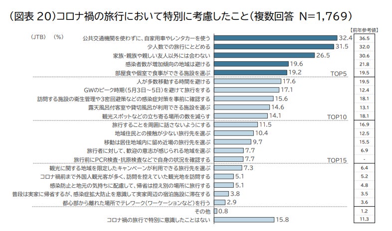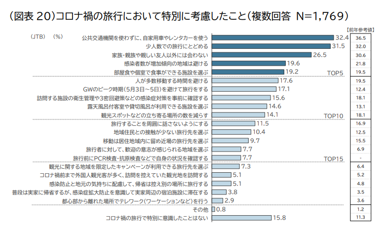 新型コロナの感染が増加傾向にある中で、感染防止にどのようなことを留意しているのかを聞きました。特に考慮したこととして、「公共交通機関を使わずに、自家用車やレンタカーを使う」が32.4%で最も多く、次いで「少人数での旅行にとどめる(31.5%)」「家族・親族や親しい友人以外には会わない(26.5%)」「感染者数が増加傾向の地域は避ける(19.6%)」「部屋食や個室で食事ができる施設を選ぶ(19.2%)」「人が多数移動する時間を避ける(17.6%)」となりました。上位項目は変更がないものの、いずれも前年に比べポイントは減少しています。一方で日並びもあってか、「GWのピーク時期(5月3日~5日)を避けて旅行をする(17.1%)」は前年より4.7ポイント増加、「露天風呂付客室や貸切風呂が利用できる施設を選ぶ(14.6%)」は1.5ポイントの増加となりました。感染拡大のフェーズが変わるにつれ旅行者の感染対策は浸透しており、意識は変わらず継続しているといえます(図表20)。