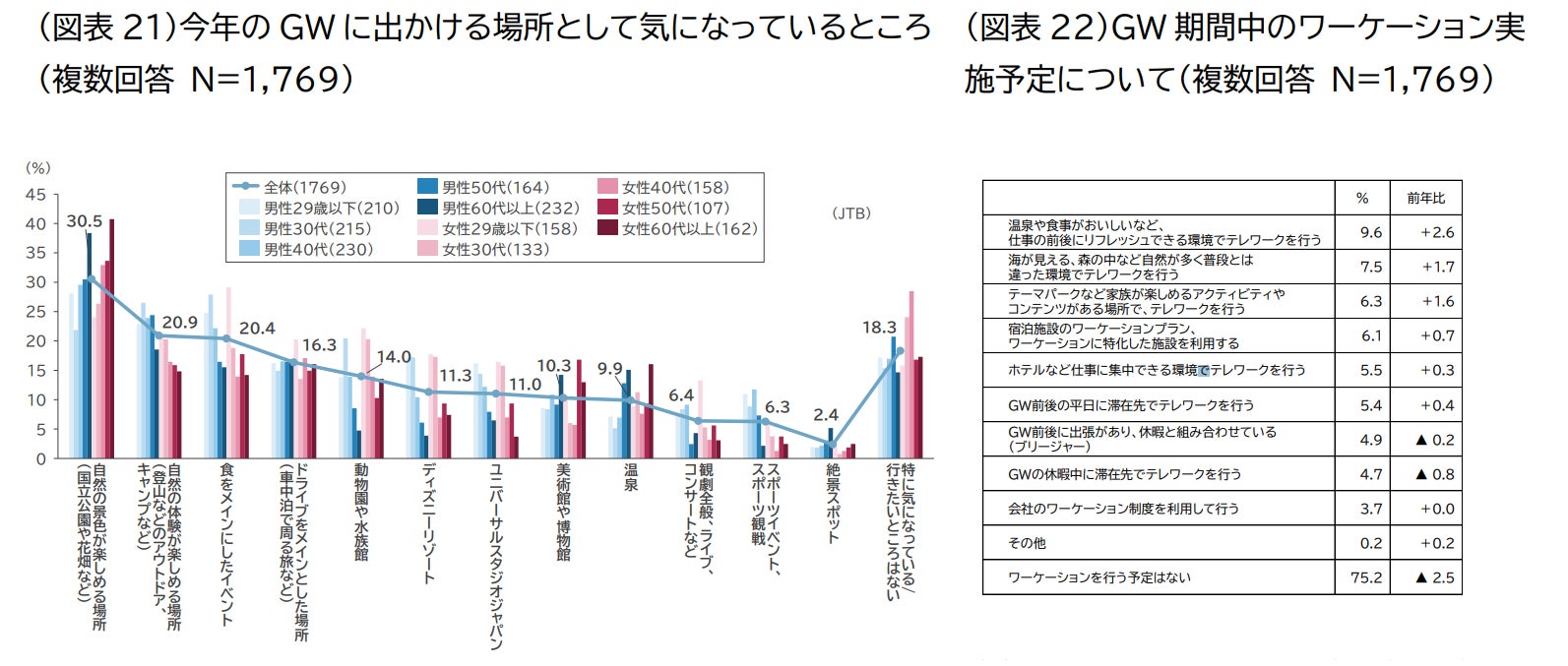今年のGWに出かける場所として、気になっているところを聞きました。その結果、最も多かった答えは、「自然の景色が楽しめる場所(国立公園や花畑など)(30.5%)」、次いで「自然の体験が楽しめる場所(登山などのアウトドア、キャンプなど)(20.9%)」「食をメインにしたイベント(20.4%)」となりました。選択肢が異なるため参考値となりますが、「特に気になっている/行きたいところはない(18.3%)」は同調査の前年30.0%から11.7ポイント減少し、全体的に旅行意欲の高まりがうかがえます(図表21)。