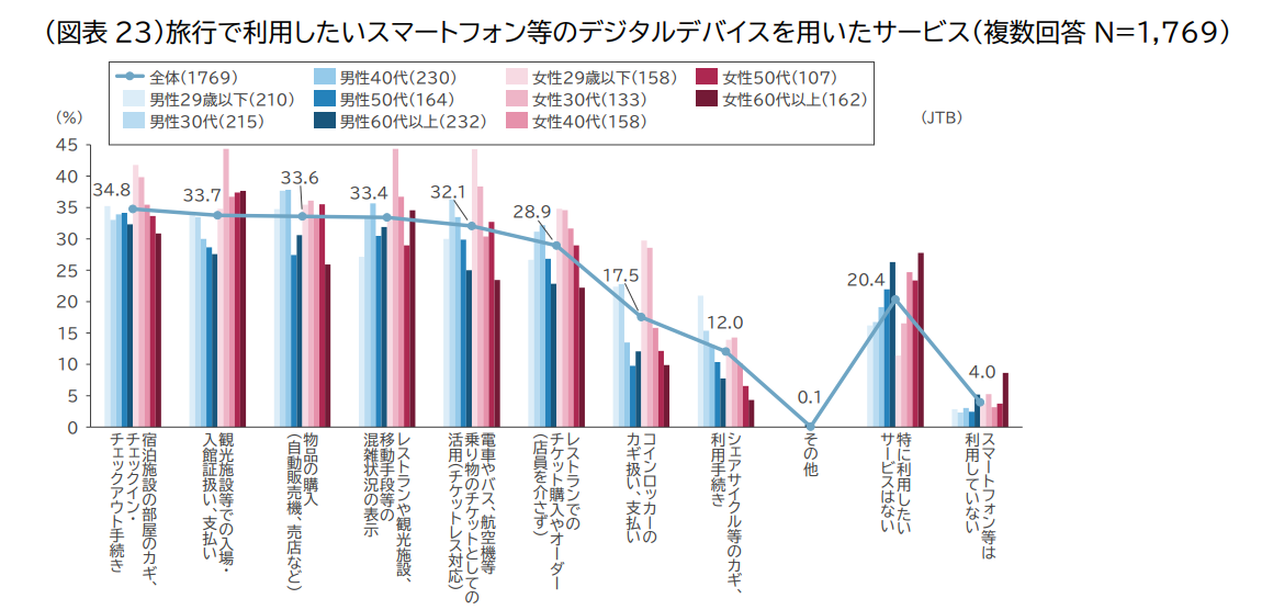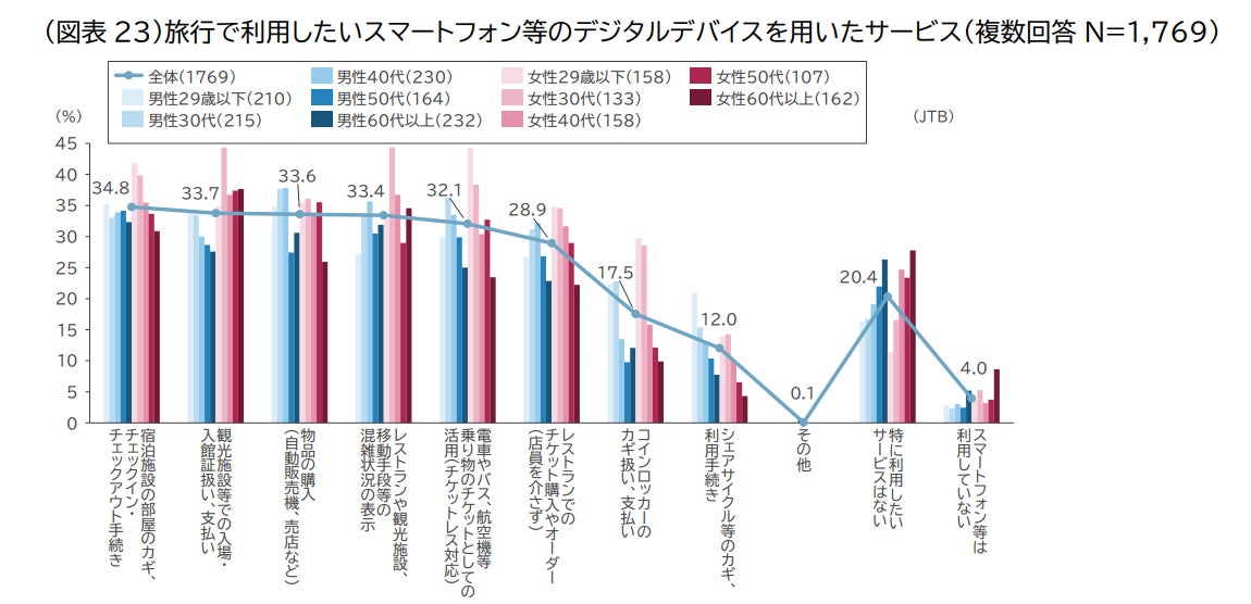 コロナ禍で、デジタル化が急速に進んでいます。旅行においても、予約・購入をはじめ、移動や観光地等での様々なサービスもQRコード*4等を通してスマートフォン等で受けられるようになってきました。そこで、どのようなサービスであれば、デジタルデバイスで受けたいかについて聞きました。最も多かった答えは「宿泊施設の部屋のカギ、チェックイン・チェックアウト手続き(34.8%)で、次いで「観光施設等での入場・入館証扱い、支払い(33.7%)」「物品の購入(自動販売機、売店など)(33.6%)」「レストランや観光施設、移動手段等の混雑状況の表示(33.4%)」「電車やバス、航空機等乗り物のチケットとしての活用(チケットレス対応)(32.1%)」となりました。既にコロナ禍前から利用が進んでいるサービスが上位となる中で、「混雑状況の表示」はコロナ禍の影響を大きく受けているといえます。また、レストラン、コインロッカー、シェアサイクルなどでの利用希望はまだ少ないものの、今後の拡大が期待されます。なお、「特に利用したいサービスはない」が20%を超えており、今後の対応次第では利用拡大の可能性もあると考えられます。性年代別では、男女とも年齢層が低いほど利用希望割合が高くなる傾向が明確にみられます(図表23)。