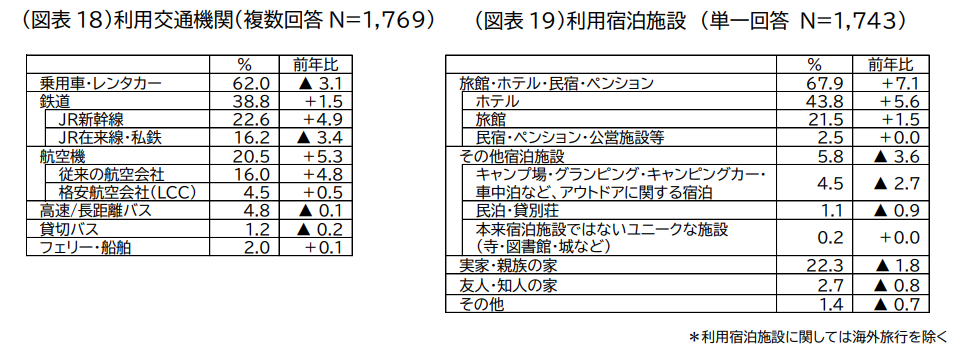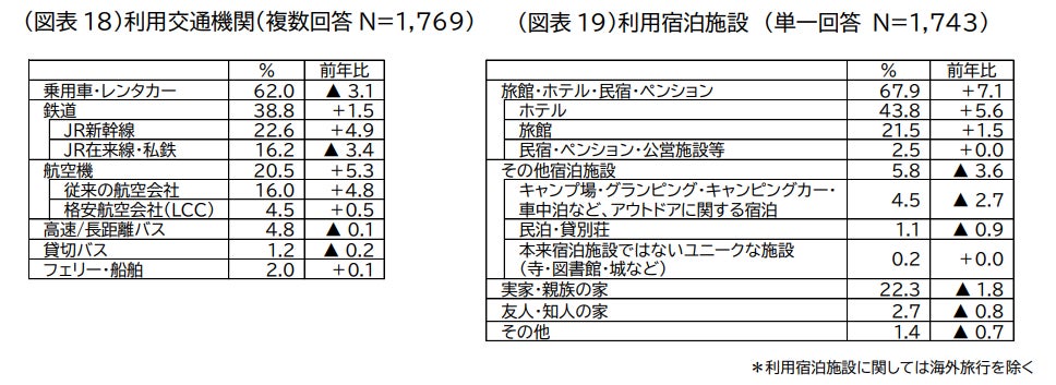 日数・費用も増加、交通機関は自家用車・レンタカーが減少、JR新幹線と航空機が増加