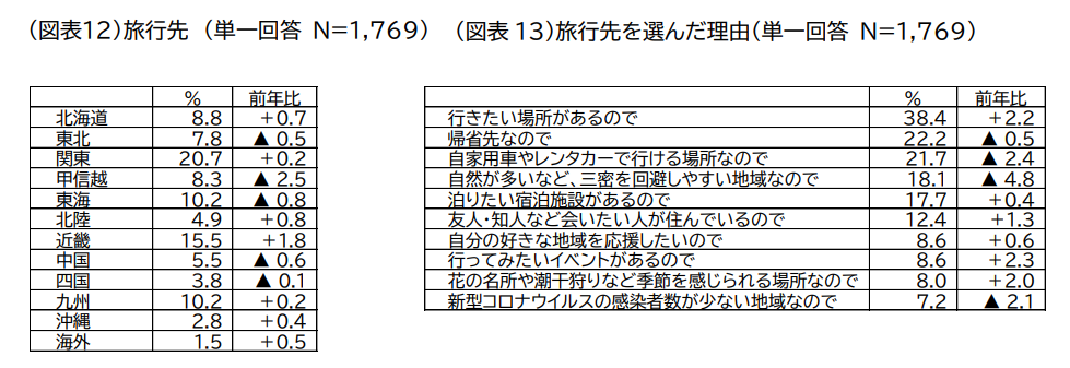 旅行先:「関東」が20.7%で最多となり、次いで「近畿(15.5%)」「東海(10.2%)」「九州(10.2%)」となっています(図表12)。その地域を選んだ理由としては、「行きたい場所があるので(38.4%)」が最も多く、前年に比べ2.2ポイント増加しました。一方で、「帰省先なので(22.2%)」は前年より0.5ポイント減少、「自家用車やレンタカーで行ける場所なので(21.7%)」は2.4ポイント減少、「自然が多いなど、三密を回避しやすい地域なので(18.1%)」は4.8ポイント減少しました。旅行先を選択する際に、感染症対策を優先する割合は引き続き高いものの、過去2年間と比べるとやや低下傾向にあるものと考えられます(図表13)。居住地別に旅行先を見ると、旅行先と居住地が同じ地方である域内旅行の割合は、「北海道(75.3%)」「東北(68.0%)」「九州(66.4%)」の3地域では7割前後でした(図表14)。一方、前年と比較すると、すべての地域で域内旅行の割合は低くなっており、遠方への旅行が増えています。特に「関東」「近畿」への旅行は、居住地域以外のすべての地域から増加する結果となりました(図表15)。後述の交通手段の結果からも言えますが、コロナ禍中は感染症対策として、自家用車など他人との接触を避けて行くことのできる近距離の観光地が旅行先に選ばれていましたが、感染拡大がこれまでに比べると落ち着き、ワクチン接種などの対策も行ったと考える人が増えているためか、遠方への旅行意欲も戻りつつあります。
