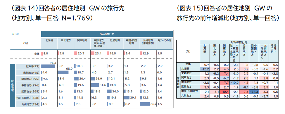 アンケートの事前調査で「GWに旅行に行く/たぶん行く」と回答した1,769名を抽出し、旅行内容について詳細を聞きました。全体的な傾向として、前年が居住地域近隣を中心としたエリアツーリズムが多かったのに対し、今年は遠方への旅行が増加し、併せて旅行日数と費用も増加傾向にあります。また利用する交通機関は自家用車・レンタカーが減少し、JR新幹線と航空機が増加しています。具体的な旅行内容は以下のとおりです。