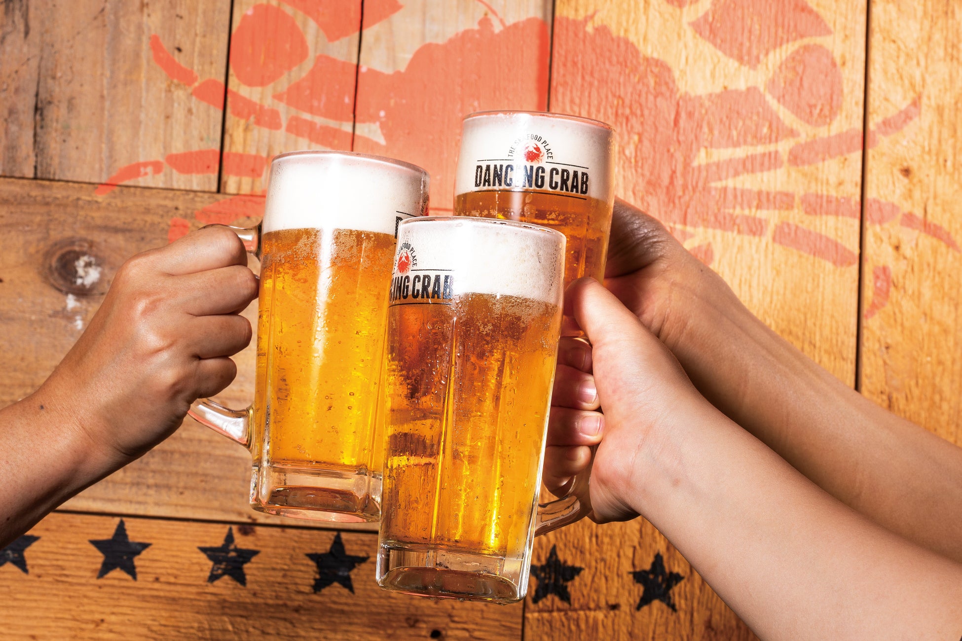 ダンシングクラブ定番のシーザーサラダやクラブケーキ、手づかみシーフードバッグを集めた「人気メニューの手づかみコース」(お1人様 5,000円税込)、シュリンプカクテルや丸ごとズワイガニが入った「贅沢シーフードの手づかみコース」(お1人様 6,500円税込)をディナータイムにオーダーされたお客様に、お1人様1杯「アサヒスーパードライ樽生」を1円でご提供いたします。