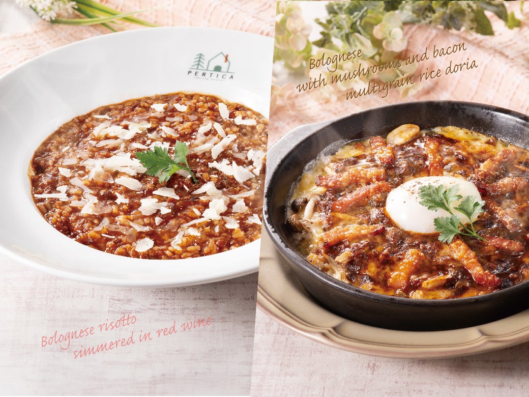 じっくり煮込んだ赤ワイン仕立ての特製ボロネーゼソースを、リゾットと合わせた一品。濃厚なコクと旨味が口いっぱいに広がります。