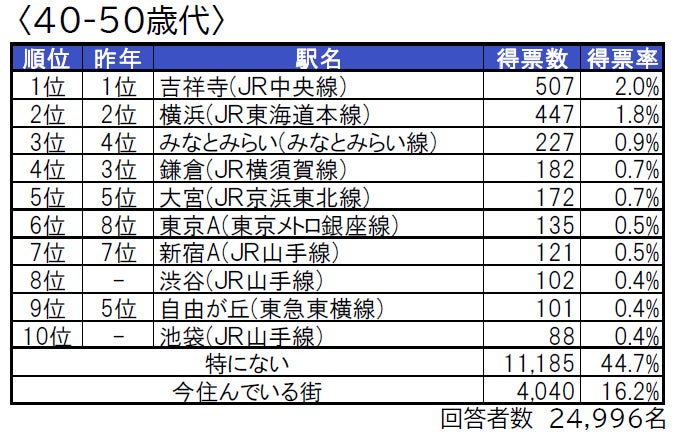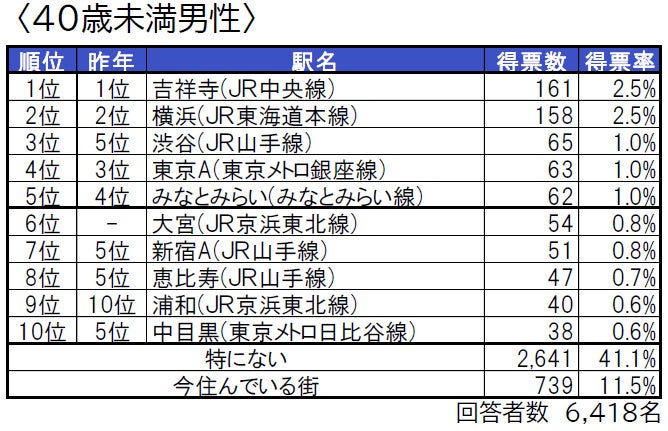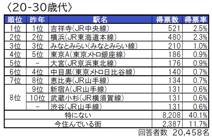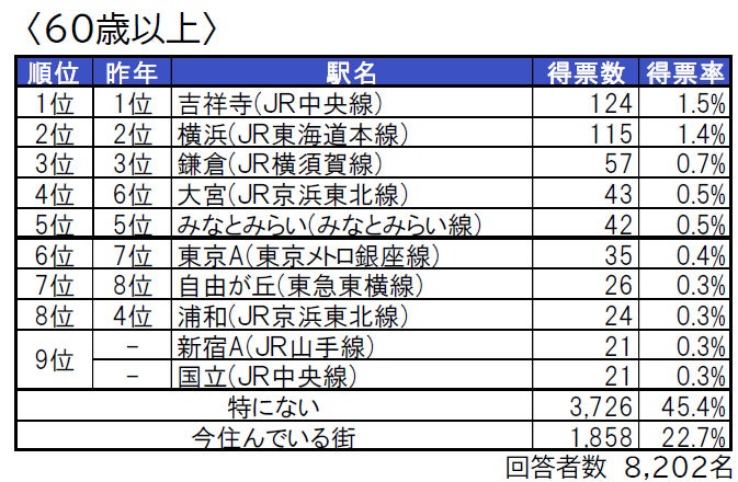 ●20-60歳以上までの全ての年代において、昨年に引き続き1位は吉祥寺、2位は横浜が選ばれています。また、みなとみらいや大宮も全ての年代でトップ5に入っています。
