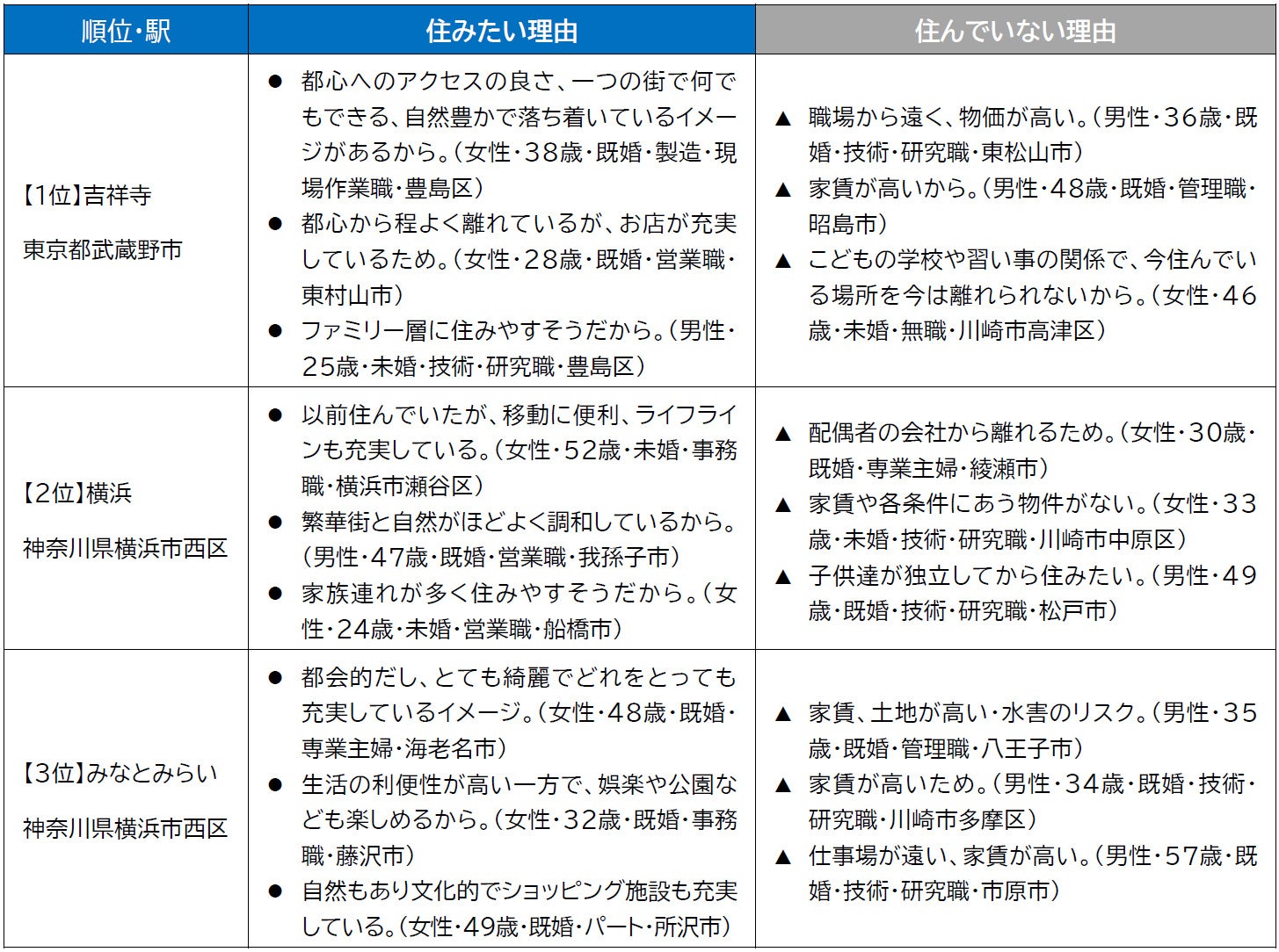 住みたい街ランキングTOP3の「住みたい理由」&「住んでいない理由」(駅・自治体)