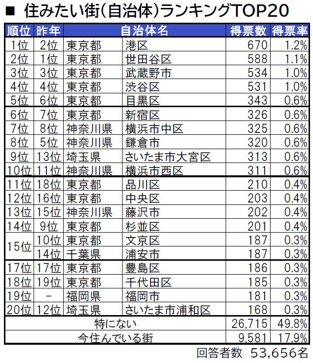 1位は東京都港区で、今年の「住みここち(自治体)」では4位となっている街です。2位は昨年1位の東京都世田谷区、3位は3年連続で東京都武蔵野市です。9位に埼玉県さいたま市大宮区(昨年13位)、10位に神奈川県横浜市西区(昨年11位)が、昨年から順位を上げてトップ10入りしています。また、福岡県福岡市が初めて首都圏以外の県から19位にランクインしています。