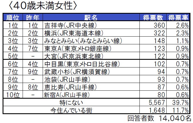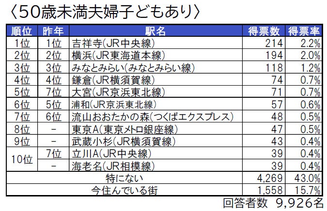 ●40歳未満の男性および女性、50歳未満の夫婦子どもありの全ての属性でも、1位は吉祥寺、2位は横浜という結果になっています。