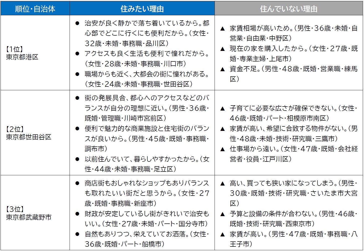 トップ3の「住みたい街」を選んだ理由は、生活や交通の利便性が良い街でありながら、自然がある、静かな環境であるなど、落ち着いた環境であることを挙げるコメントが多く見られます。一方で、「住んでいない理由」については、家賃の高さや通勤のしにくさ等のコメントが多くなっています。