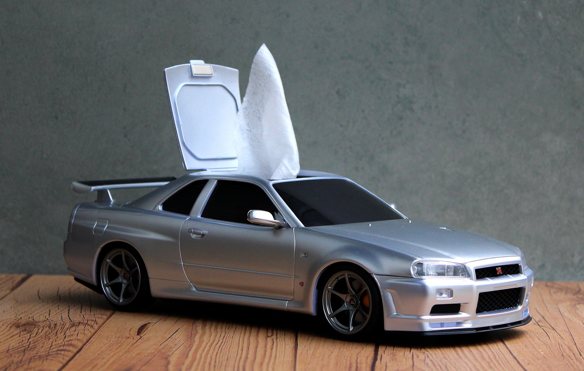 ブレーキキャリパーやホイールの造形もこだわった作りとなっており、使わない時でもインテリアとして飾っておくことができる、GT-Rファンにはたまらないウェットティッシュケースです。