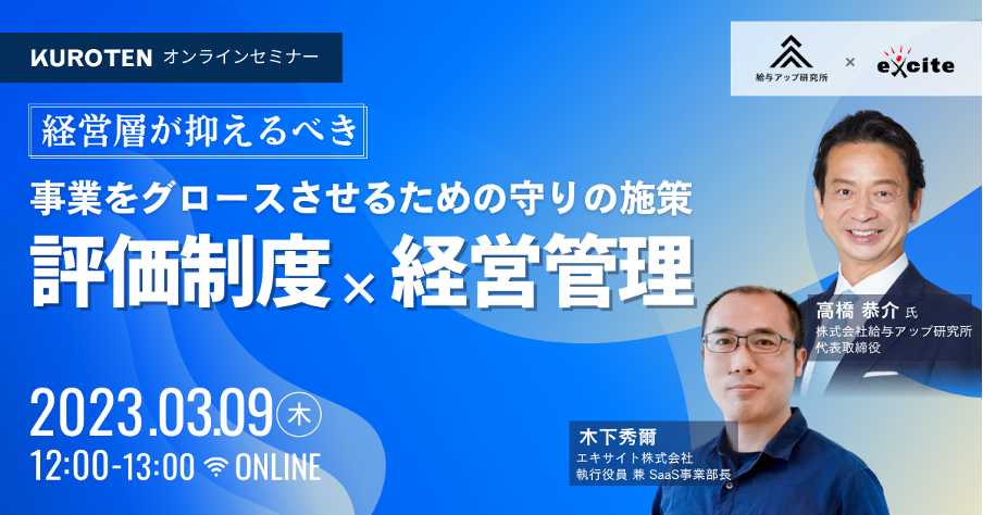 エキサイト株式会社(所在地:東京都港区、代表取締役社長:西條 晋一)は、株式会社給与アップ研究所(本社:東京都千代田区、代表取締役:高橋 恭介)と共同で、2023年3月9日(木)12:00より「事業をグロースさせる守りの施策 評価制度×経営管理」をテーマに参加費無料のセミナーを開催します。