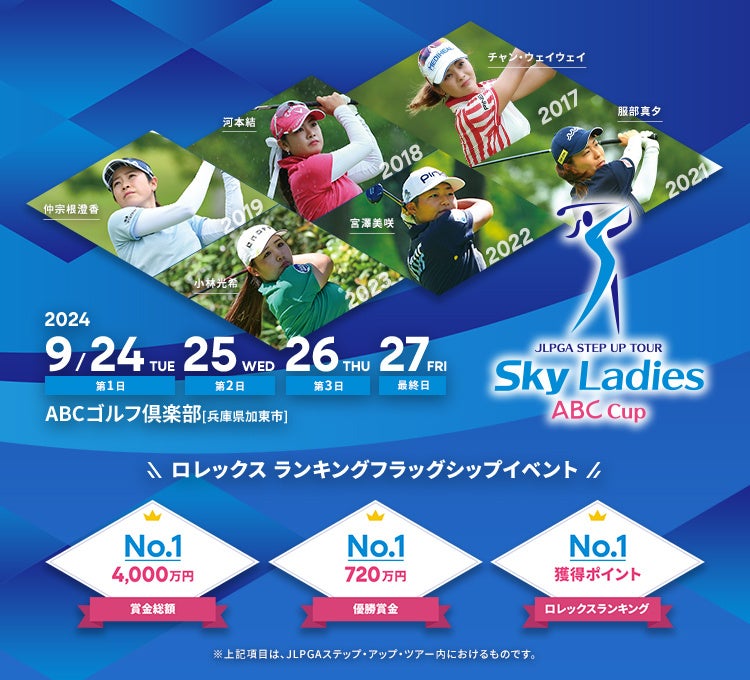 今年の「Skyレディス ABC杯」も、2024年度 JLPGAステップ・アップ・ツアー「ロレックス ランキングフラッグシップイベント」として開催されます。賞金総額、優勝賞金、そしてロレックス ランキングの獲得ポイントも、JLPGAステップ・アップ・ツアーの中で、最高の大会となります。