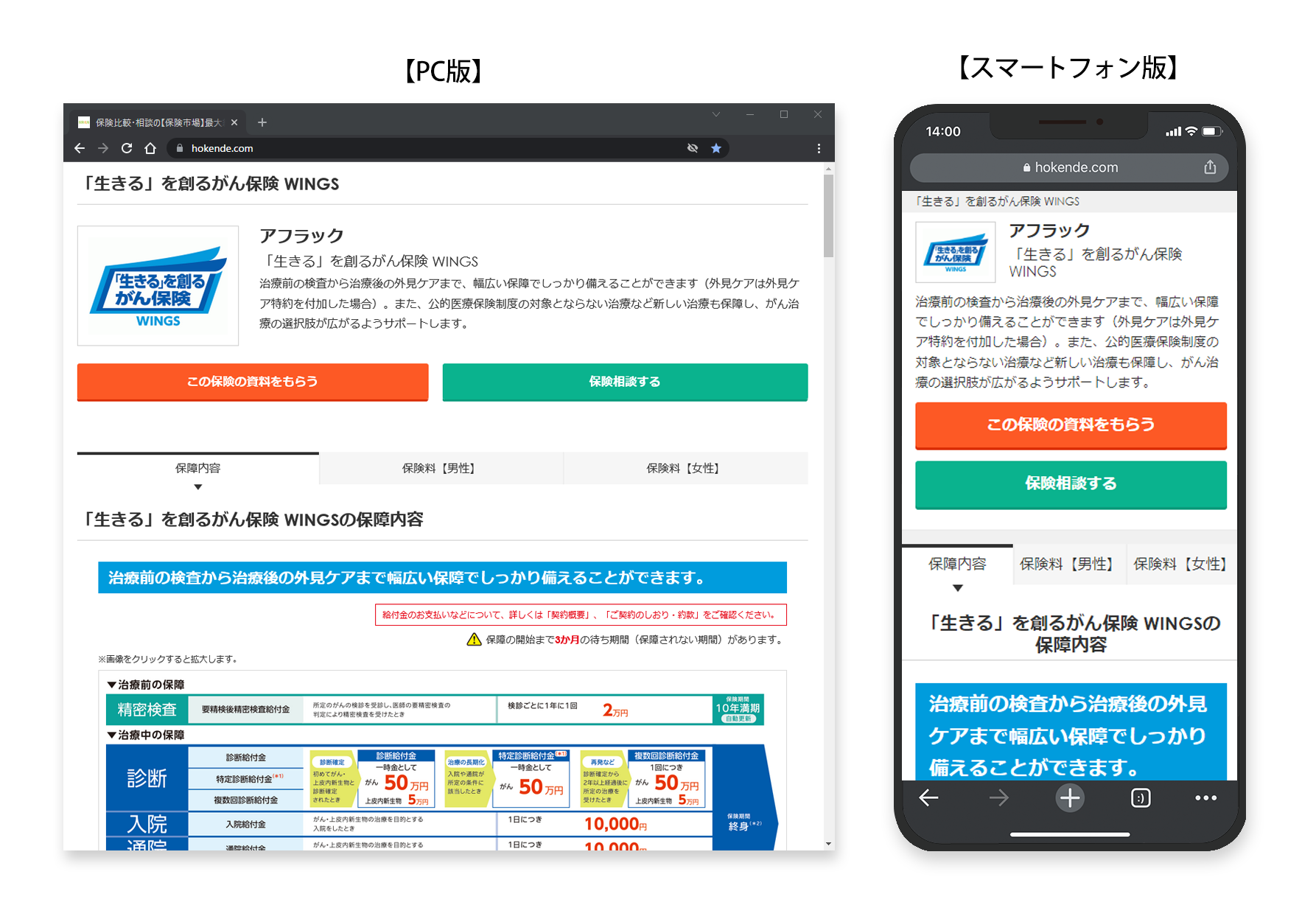 保険選びサイト「保険市場」に掲載を開始したアフラックの『「生きる」を創るがん保険 WINGS』は、通信販売および対面販売でお申し込みいただける保険商品です。「保険市場」PCサイトおよびスマートフォンサイトにて、商品の詳細をご確認いただけます。