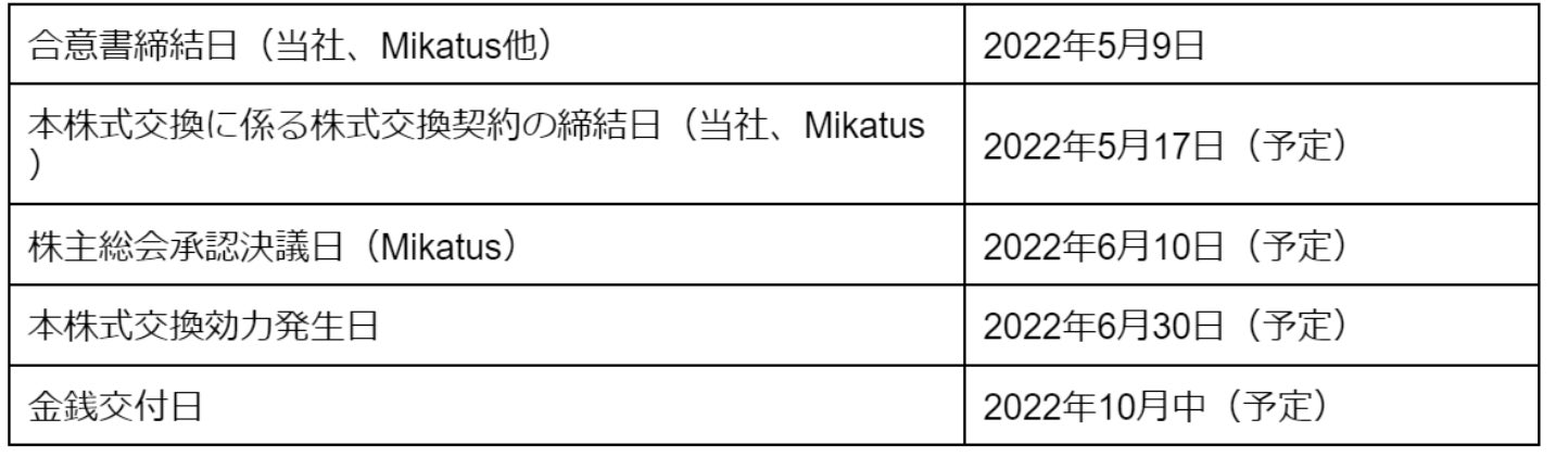 freee株式会社(本社:東京都品川区、代表取締役CEO:佐々木大輔、以下「freee」)は、2022年5月9日付の取締役会において、Mikatus株式会社(本社:東京都中央区、代表取締役社長:田中啓介、以下「Mikatus」)を現金対価での簡易株式交換(以下「本株式交換」、効力発生予定日:2022年6月30日)により完全子会社とする旨の合意書の締結を決議し、両社間で合意書を締結いたしました。