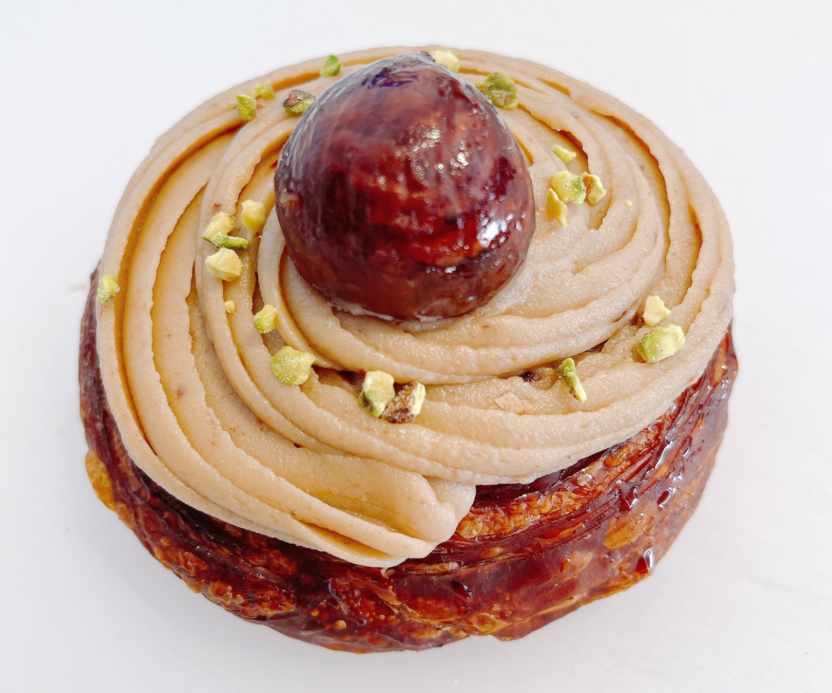 渋皮栗のクリームをモンブラン風に絞り、渋皮栗とピスタチオをトッピングしました。