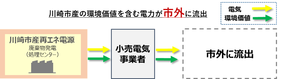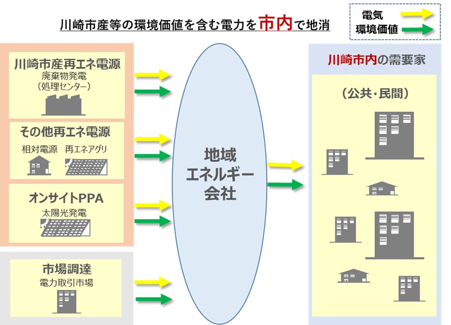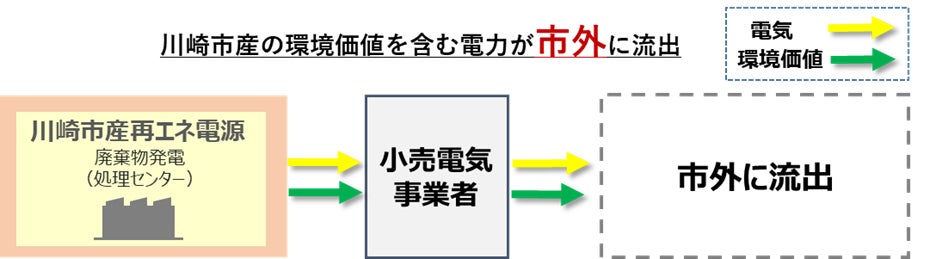川崎未来エナジー株式会社では、電力小売り事業を通じてこれまで市外に流出していた廃棄物発電の電力としての価値および環境価値を、地域エネルギー会社を介して川崎市内の需要家へ供給することで、地域自立型の脱炭素化・再エネ地産地消を実現します。
