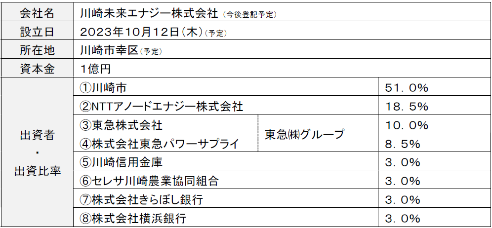 東急㈱グループでは、昨年6月に川崎市が公募した「川崎市地域エネルギー会社」の設立に向けた事業パートナーの選定に係る公募型プロポーザルにおいて、同年12月にNTTアノードエナジーを代表とし東急㈱グループが参画するコンソーシアムが、優先交渉権者として選定されたことを受け、会社設立に向け川崎市などと協議を進めてきました。