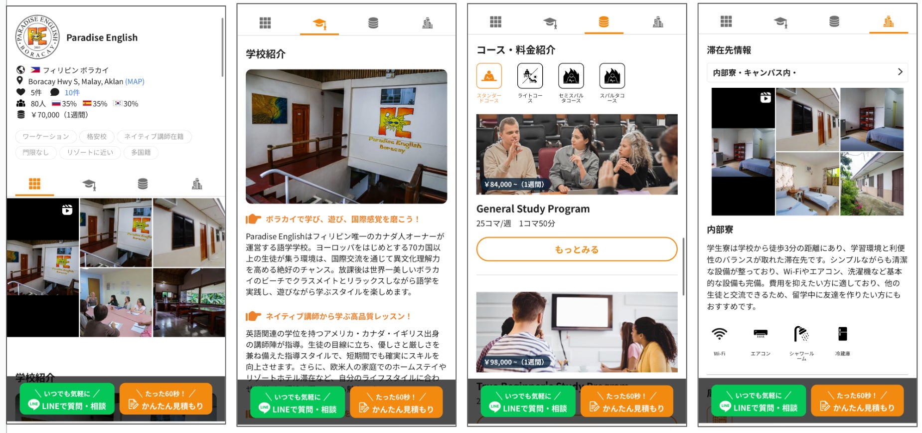 ネイティブキャンプ留学では、ユーザーが必要な情報を分かりやすく把握できるよう、常に丁寧で明確な情報提供を心がけています。Paradise Englishの詳細情報は、以下の4つのカテゴリーに分けて掲載しており、知りたい情報を的確にお届けします。