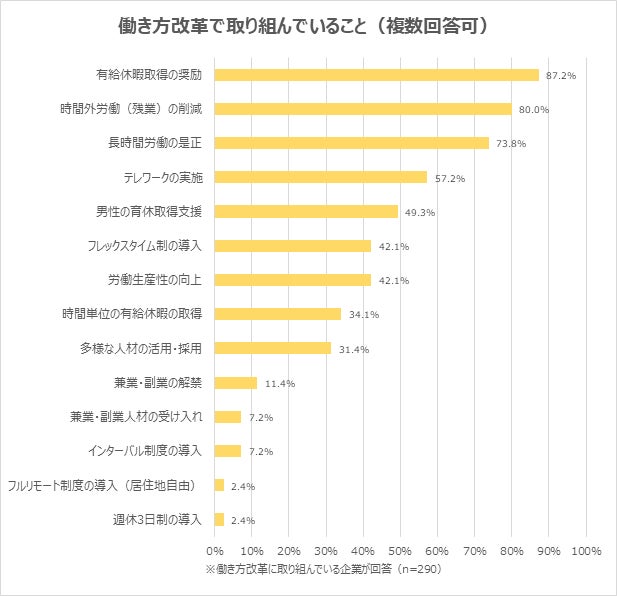 7割以上の企業が「働き方改革」を実施。「若い世代の定着のためには、働きやすさが不可欠」「働き方改革と生産性の向上を両輪で進めていきたい」の声