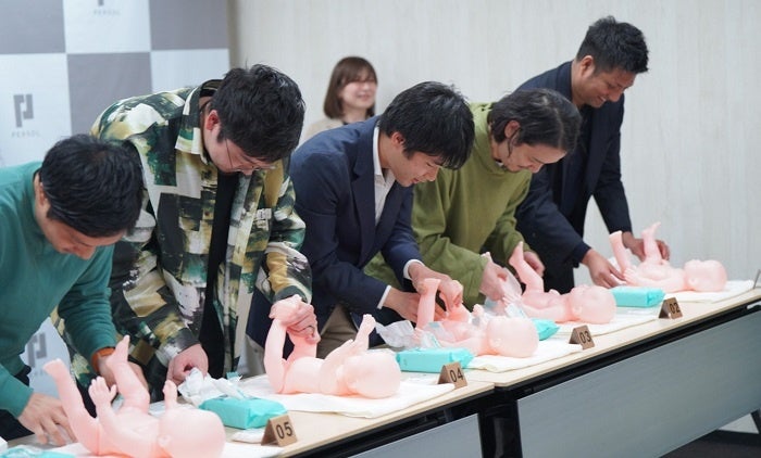 発足式では、リアル・オンラインで合計23名が参加し、それぞれ「男性育休サポーター」としての想いをフリップに書き、宣言を行いました。その後、公益社団法人 東京都助産師会から派遣された助産師によるおむつ替え講習に続き、赤ちゃん人形を使ったおむつ替え選手権が開催されました。8名の出場選手の中から、おむつ替えタイム58秒の金村魁さんがおむつ替えチャンピオンに輝きました。おむつ替えタイムに、おむつの仕上がり度(テープの締め付け、左右対称、ギャザーの向きなど)ややさしさ度(タッチや声かけなど)も加味され、現役の助産師による審査によりチャンピオンが決定しました。
