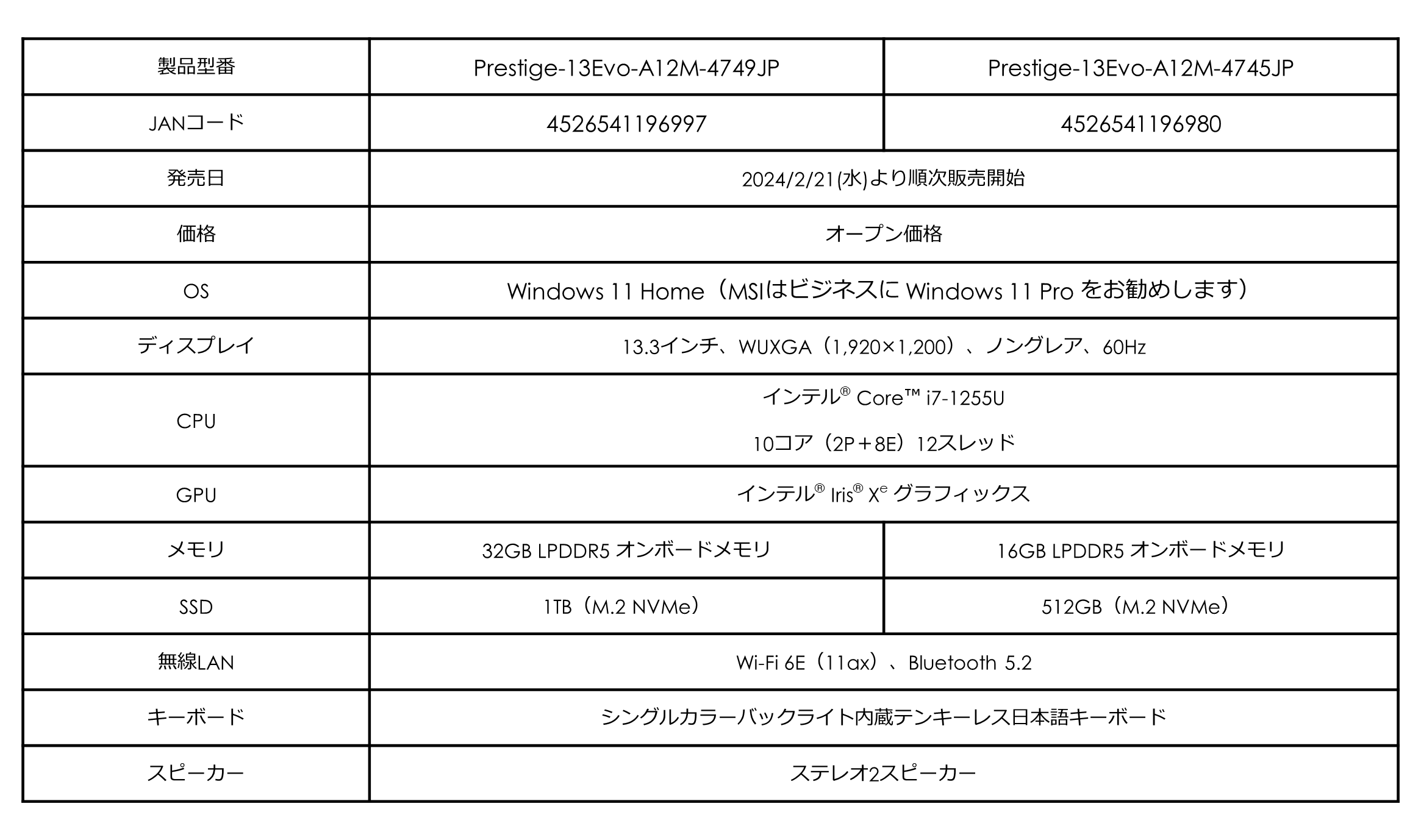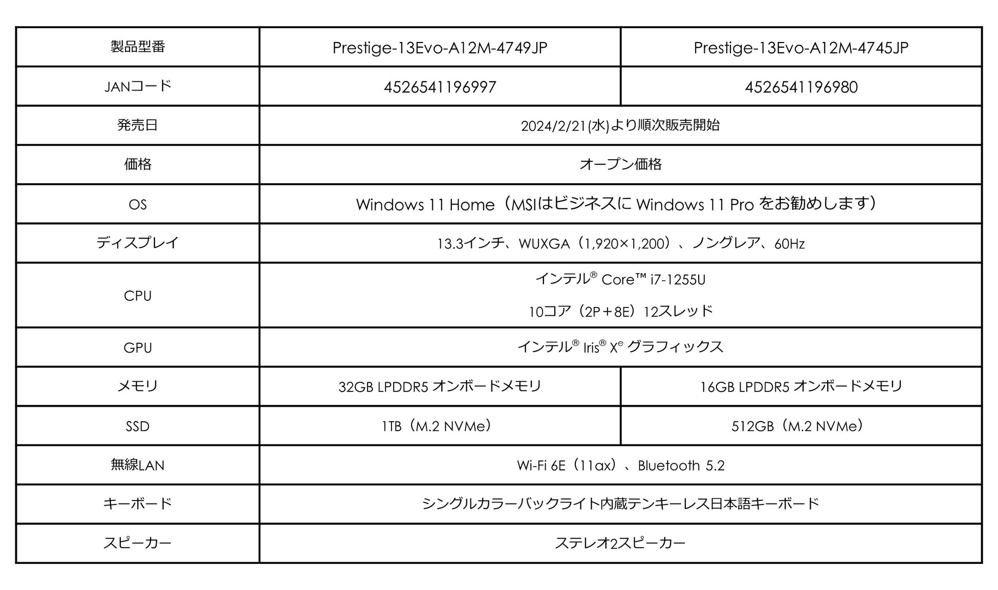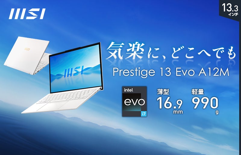 990gの超軽量本体にCore™ i7と大容量32GBメモリ搭載パワフルビジネスノート 「Prestige-13Evo-A12M-4749JP」を2024年2月21日(水)より販売開始