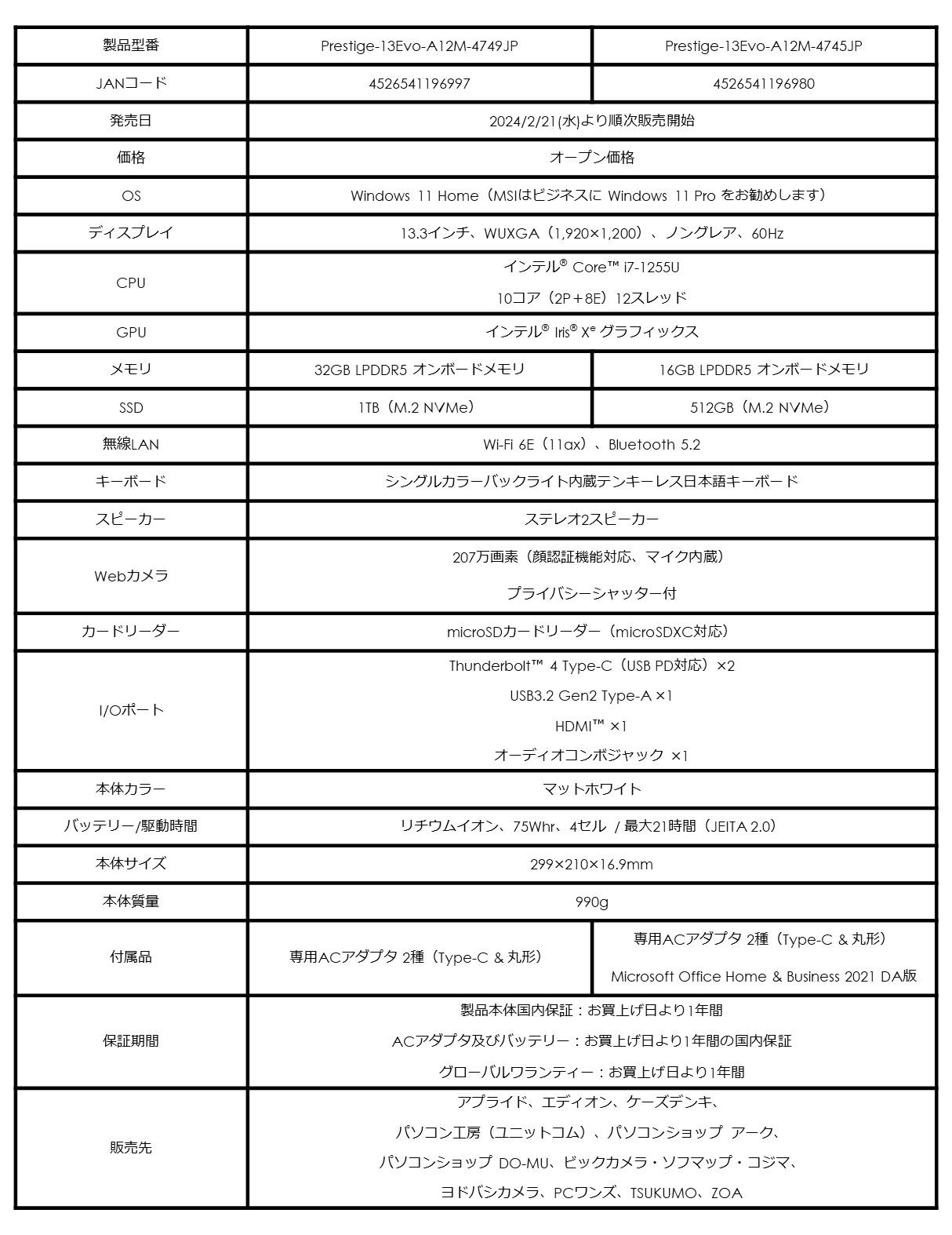 ~Microsoft Office搭載モデル「Prestige-13Evo-A12M-4745JP」も同時発売~