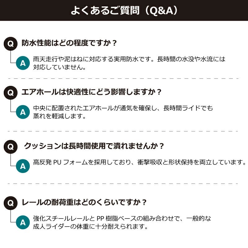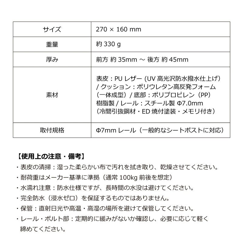 ・表皮の清掃:湿った柔らかい布で汚れを拭き取り、乾燥させてください。 ・耐荷重はメーカー基準に準拠(通常100kg前後を想定) ・水濡れ注意:防水仕様ですが、長時間の水没は避けてください。 ・完全防水(浸水ゼロ)を保証するものではありません。 ・保管:直射日光や高温・高湿の場所を避けて保管してください。 ・レール・ボルト部:定期的に緩みがないか確認し、必要に応じて軽く締めてください。
