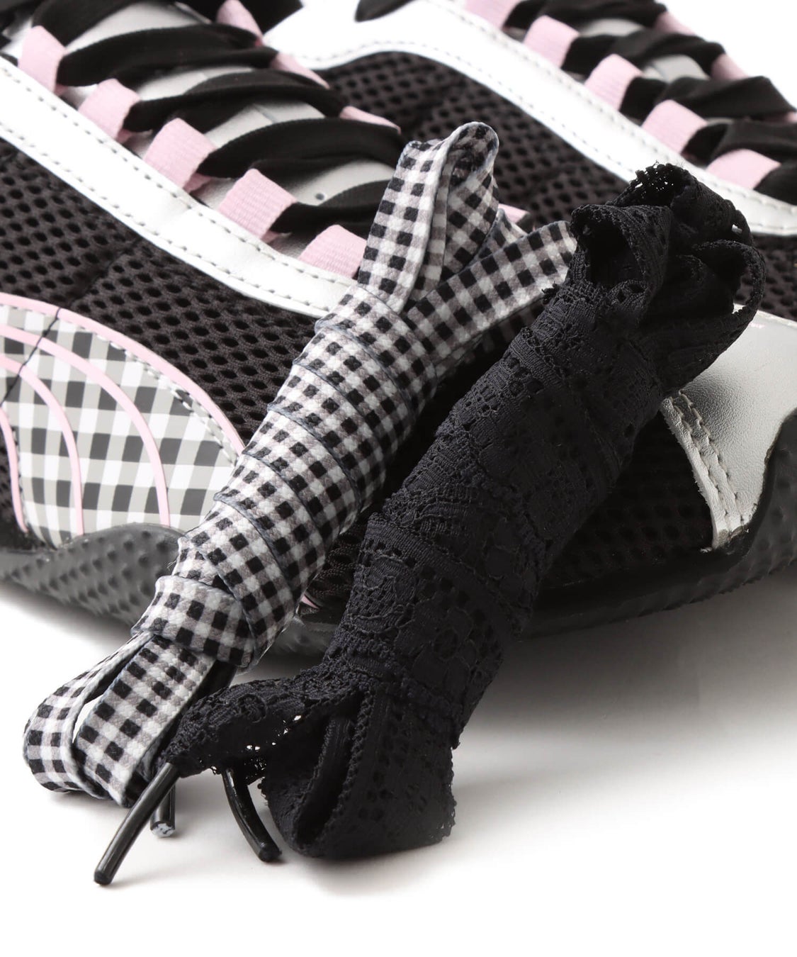 セットされているシューレースはブラックのほかに、レースタイプとギンガムチェックの3種が用意されており、様々なアレンジや、スタイルの気分によって楽しんでいただけます。
