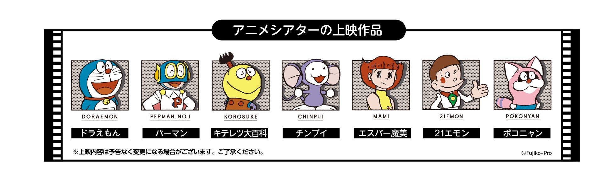 会場内のアニメシアターエリアでは、藤子・F・不二雄の人気作品中、7作品をお楽しみいただけます。毎日上映いたしますので、ぜひこの機会にお楽しみください。