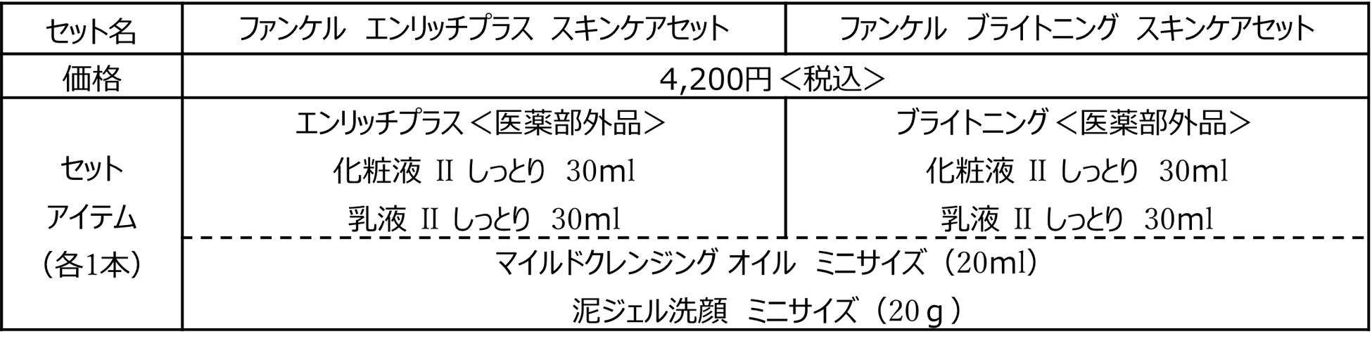ファンケルのスキンケアライン「エンリッチプラス」、「ブライトニング」(共に医薬部外品)の化粧液、乳液の本品に、人気のクレンジングと洗顔料のミニサイズをセットにした数量限定の商品です。大切な方にプレゼントするギフトとしてもお喜びいただけるよう、デザインにもこだわりました。