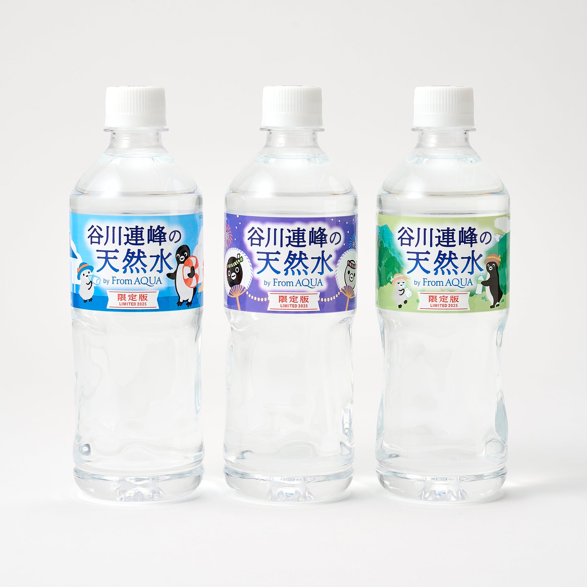 「谷川連峰の天然水 by From AQUA」夏季限定のSuicaのペンギンラベル。Suicaのペンギンと子ペンギンがかわいらしく夏を満喫する様子が描かれており、海・山・祭りをテーマに3種のイラストで展開。