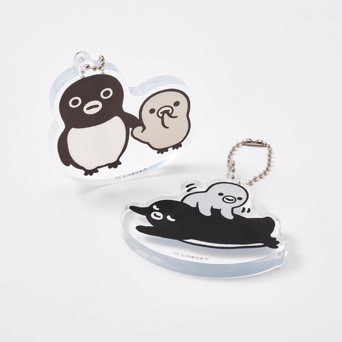Suicaのペンギンと子ペンギンをプリントしたゆらゆら揺れるアクリルキーチェーンです。厚みがあるので立てて飾れます。こちらをじーっと見つめるSuicaのペンギンと子ペンギン、ふぅーっとリラックスするSuicaのペンギンをもみもみする子ペンギンの2種類展開です。