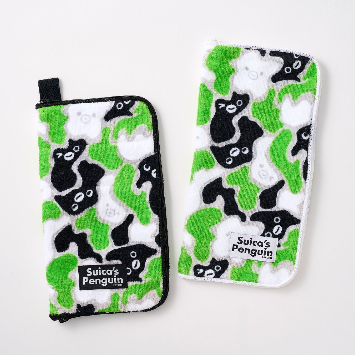 タオルのふりをしてコソッとポーチになる「どっとポーチ」。Suicaのペンギンと子ペンギンをカモフラージュ柄に落とし込んだ目を引くデザインです。ベーシックは、コスメやペンケースとしてはもちろん、ペットボトルや濡れた傘などもカバーしてくれます。キープスタンドは、内側に保冷・保温にすぐれたアルミシート付きでペットボトルや缶飲料を入れるのにぴったり!底面をセットすると自立が可能なので、ピクニックなどの屋外シーンにも◎。