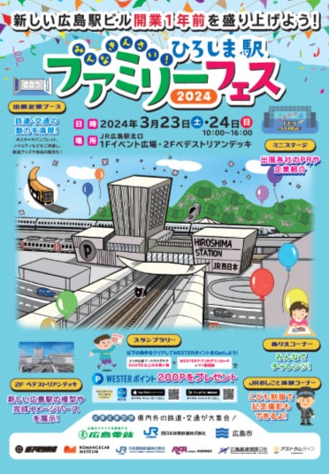 開業を1年後に控え、広島駅ビル開業を多くのお客様に知っていただくこと、また、鉄道の魅力を改めて知っていただくことなどを目的に、この度、各鉄道会社などと共同で3月23日(土)、24日(日)の2日間、広島駅北口イベント広場を中心として、「新しい広島駅ビル開業1年前を盛り上げよう!みんなきんさい!ひろしま駅ファミリーフェス2024」を初めて開催することとなりましたので、お知らせします。