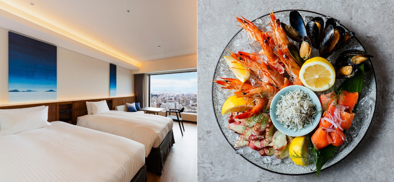 コンセプトフロア“瀬戸内”の「サウスゲートツイン」(左)、朝食内「シーフードマルシェ」(右)